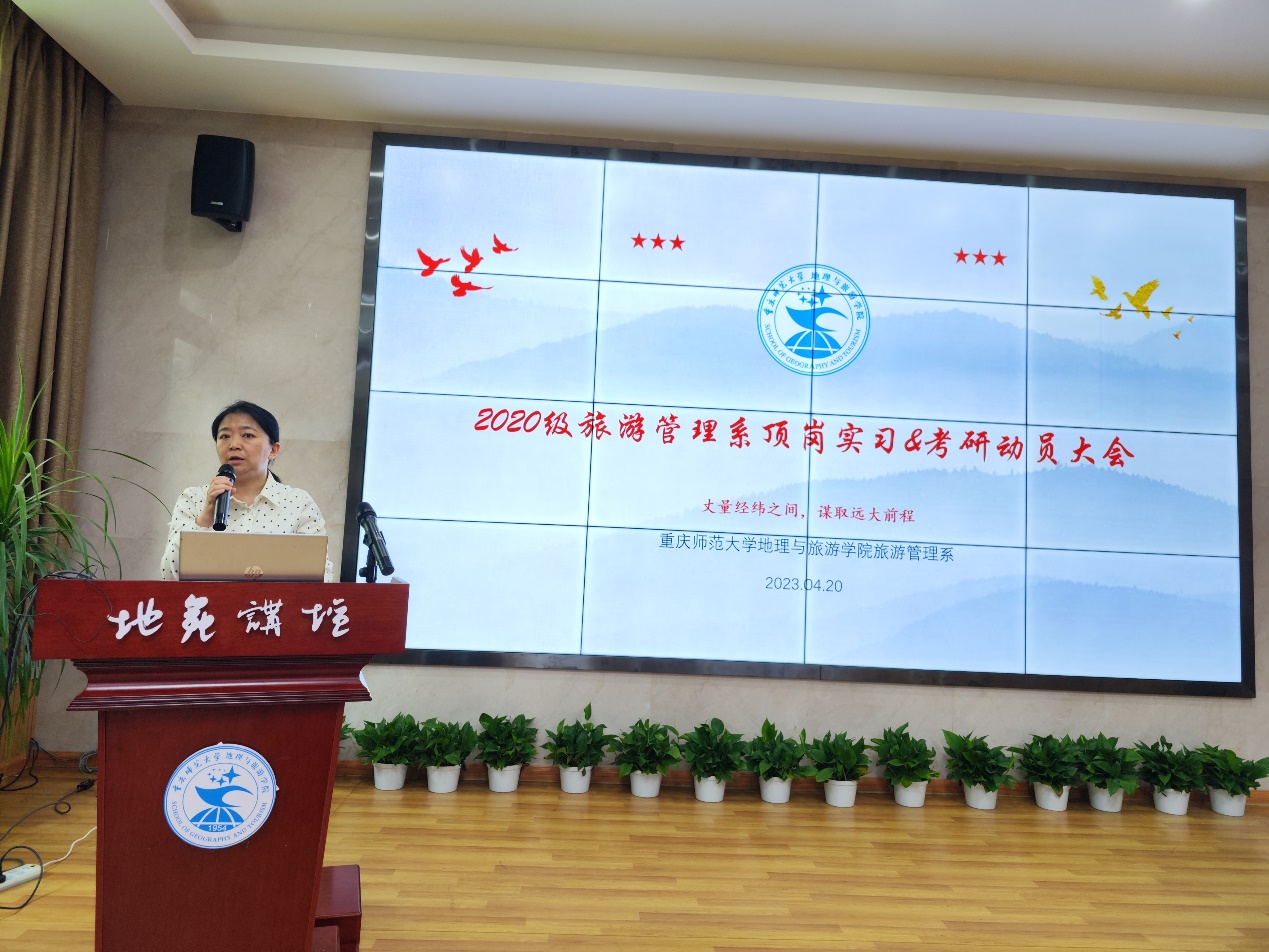 时光飞逝,转眼间2020级旅游管理系的各位同学已经成为大三的学长学姐,经过三年的学习,2020级的各位同学面临考研还是实习的重要选择,不少同学对于未来的决定存在许多的困惑。因此,学院于4月20日下午举行旅游管理专业顶岗实习以及考研动员大会,为同学们动员鼓劲和答疑解惑。出席本次活动的领导和老师有学院党委书记胡芳老师、副院长刘睿老师、旅游管理系副主任张海龙老师和周刚老师,参与本次活动的学生为2020级旅游管理专业三个方向近160余人。
