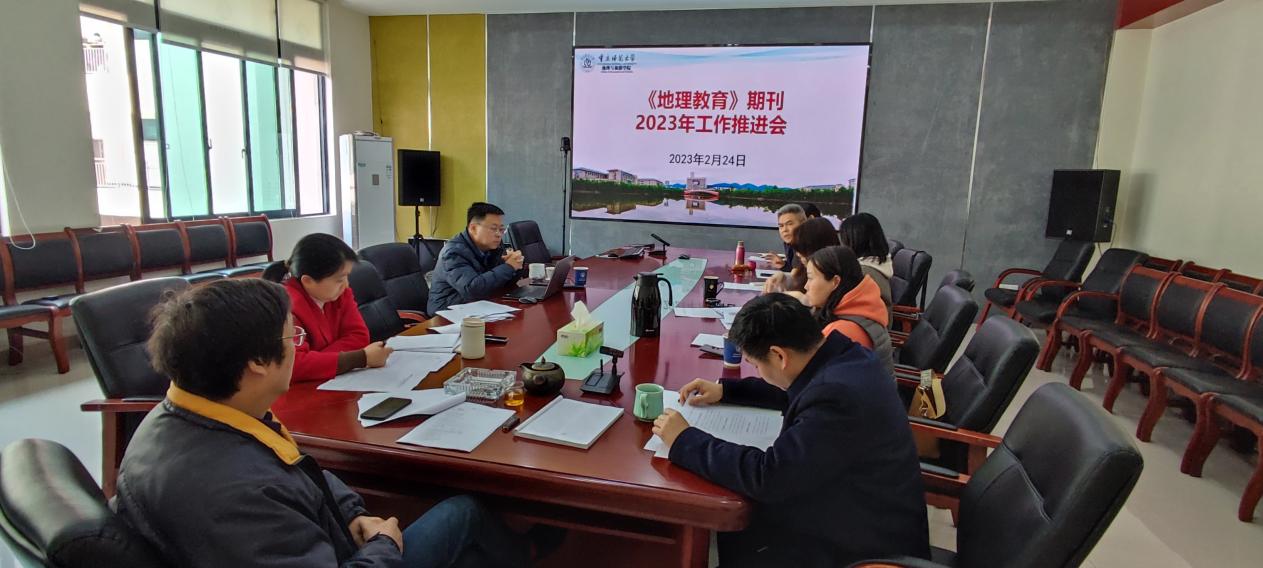 在致用楼335会议室召开了《地理教育》期刊2023年工作推进会。学院胡芳书记、主持工作的韦杰副院长、分管《地理教育》的刘睿副院长、《地理教育》编辑部成员及部分编委老师出席会议。会议由副院长刘睿主持。