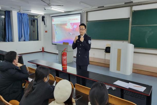 在培训会上,唐露轩教官以生动的实例和数据向在场的师生介绍了火灾的严峻形势。他强调今年11月消防月的主题:“预防为主,生命至上”,并通过去年在缙云山山火和北京长峰医院发生的火灾案例,引发了对火灾的深刻思考和警示。“平均每十五天牺牲一名消防员,消防员平均年龄仅为20岁。提高安全意识,做好安全防范工作,不仅是对我们自己负责,还是对消防员负责!生命无价,我们需怀有敬畏之心。”唐教官通过数据、图像、视频等方式生动地讲解了消防安全工作的重要性、讲解火灾的种类和起因,并针对不同火种向大家传授正确的防范措施,还讲述了公共场所和家庭防火的基本常识以及在火场中易出现的一些逃生误区和正确的逃生自救方法,让在场的师生感受到火灾的严重性,也加深了对消防安全隐患的警觉性。