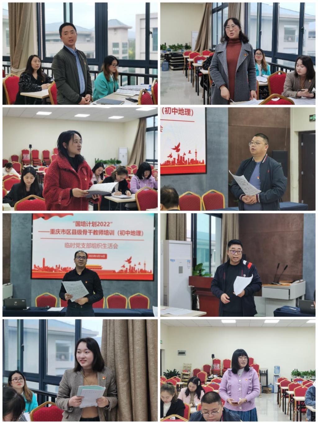 3月16日下午,“国培计划2022”—重庆市区县级骨干教师培训(初中地理)临时党支部在致用楼547教室召开组织生活会,国培学员中全部20位党员同志参加会议,国培班班主任、学院党委宣传委员王才军老师、学院专职组织员杨扬老师列席会议。