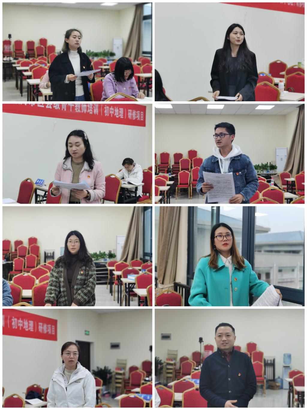 会议第三环节由国培班每位党员同志结合工作实际逐一进行学习心得交流。党员同志们踊跃发言,大家结合自己的实际工作,从党员在日常教育教学工作中的模范带头作用、中学地理课堂中开展课程思政以及新的发展理念思想在教学内容中的融合等角度分享了自己的学习心得。