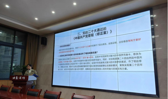 接着,胡芳书记带领教职员工们一起学习了党的二十大通过的三个决议:一是学习了解《中国共产党章程(修正案)》的主要修改内容,明确其对党员和党的干部提出的新要求、对党的基础组织和党组织作出的新规定、对党的纪律所作的调整和完善。二是学习了解关于十九届中央纪律检查委员会工作报告的决议,坚持按要求以严的基调强化正风肃纪,一体推进不敢腐、不能腐、不想腐,坚决打赢反腐败斗争攻坚战持久战,锻造忠诚干净担当的党员干部队伍。三是学习了解关于十九届中央委员会报告的决议,强调持之以恒推进全面从严治党,坚持不懈用习近平新时代中国特色社会主义思想凝心铸魂,完善党的自我革命制度规范体系,建设堪当民族复兴重任的高素质干部队伍。