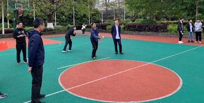 学院领导与学生一起为运动员击鼓加油 学院领导与学生志愿者在一起