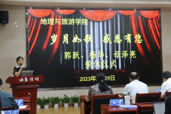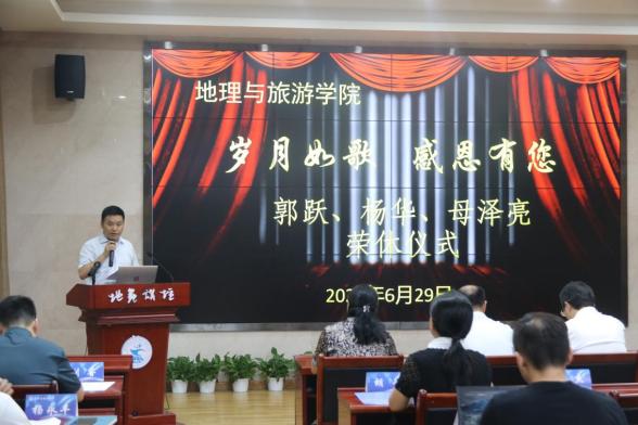 为光荣退休的郭跃老师、杨华老师和母泽亮老师举行荣休仪式。学校孟小军副校长,人事处吴佳贵副处长,工会刘涛副主席,及学院党政领导、全体教职员工齐聚一堂,热烈欢送三位老师光荣退休。荣休仪式由学院党委胡芳书记主持。