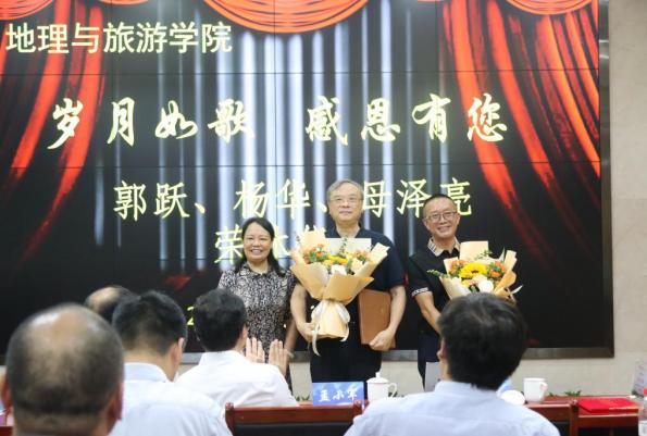,风华正茂,光彩耀人,自投身教育事业,就默默耕耘,不计得失,于平凡之处见伟大,于细微之中显精神,为学院、为学校的发展做出许多重要贡献。吴佳贵副处长为在场的郭跃老师、杨华老师颁发了荣休证书和纪念品,并表达了对三位老师的敬意和祝愿。校工会刘涛副主席向在场的两位老师赠送了荣休纪念册、礼品与鲜花,感谢三位老师为学院、学校所做出的贡献并表示三位老师永远是工会的一员。学院在职教师汪洋、刘睿、杨永丰代表全体教师回顾了与三位老师一起度过的难忘岁月,表达了对三位教师的崇高敬意和感恩之情,送上了美好祝愿。在场的郭跃老师、杨华老师分别发言,回忆了在学校工作以来的点点滴滴,他们抚今追昔,感谢学院学校对他们的培养,言谈中饱含着对教育科研事业的忠诚与热爱,深蕴着对学校发展的期望,充满着对学院学校的深深眷念,对同事的深深情谊,对后辈的深切关爱。远在海外的母泽亮老师录制了祝福视频,期望学院在年轻老师们的努力下发展壮大。