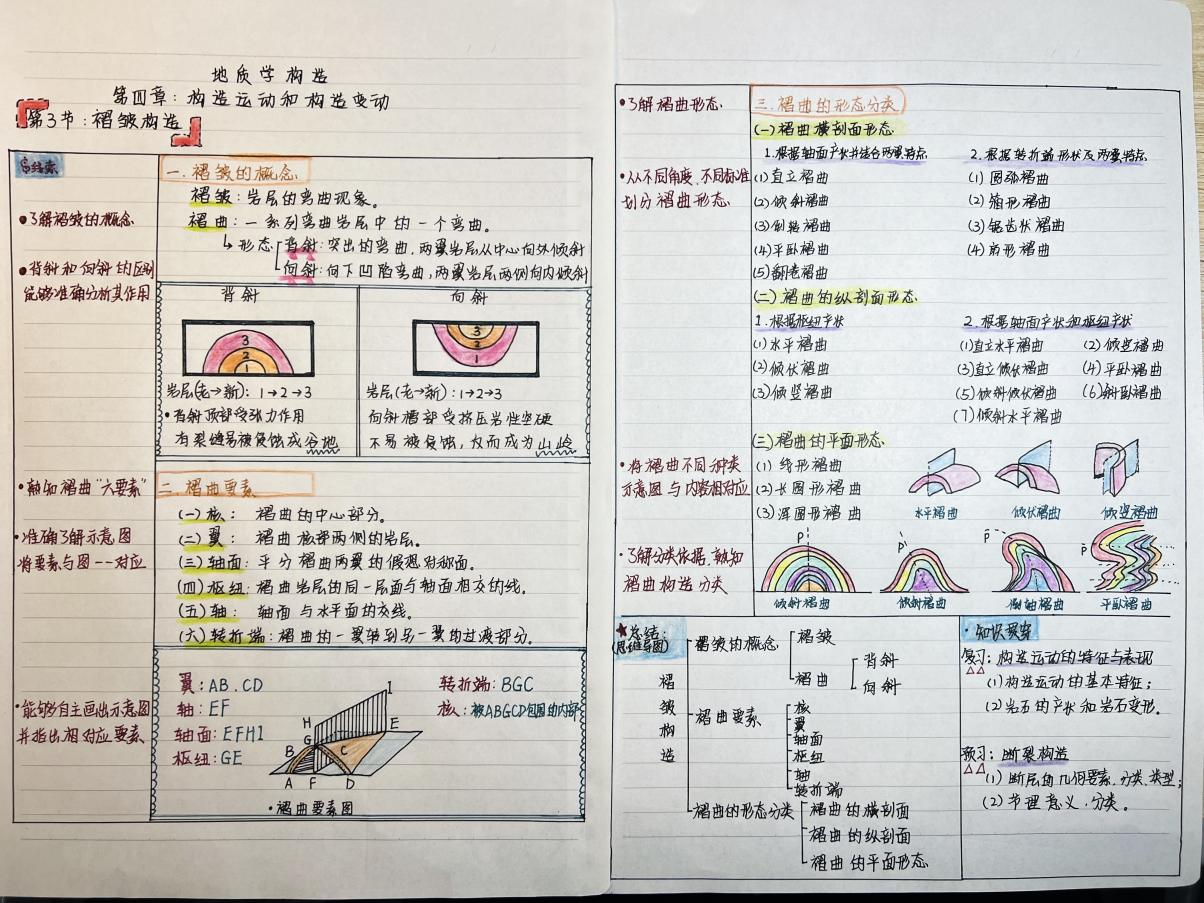 本次比赛要求的课堂笔记是指在学习过程中记录的学习笔记,作品形式和风格不限,书写内容包含实验记录、学习记录等。通过对作品的字迹工整度、逻辑条理性、内容整齐度、笔记方法新颖性等多方面的评审,23级地理科学类4班钟慧同学的笔记作品脱颖而出。她展示了《地质学构造》的笔记,字迹工整,条理清晰,色彩鲜明,图文并茂,让人眼前一亮。她的作品不仅体现了其上课认真踏实的态度,还为同学们树立了良好的榜样。