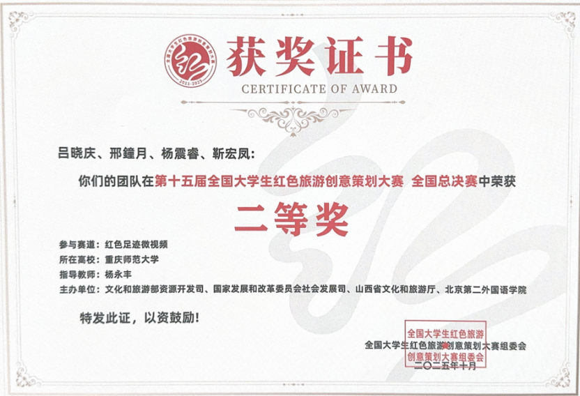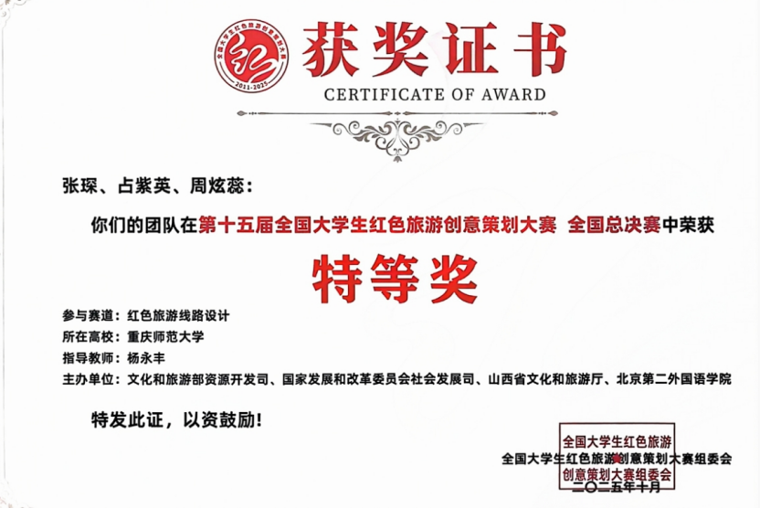 第十五届全国大学生红色旅游创意策划大赛,是全国范围内以大学生为主体的规模最大的红色旅游主题专业赛事,是教育部全国大学生思想政治工作精品项目。本届大赛吸引了全国1001所高校、6002支队伍、3万余名师生参加,提交作品5144项。组委会经过初评打分、复评审议、四轮专家评议、内容审核等多重环节,全国60支参赛队伍进入决赛,av大平台 有两支队伍进入决赛。本次获奖检验了旅游管理专业师资队伍教学能力和教学水平,展现了av大平台 学生风采和旅游教育支撑产业发展的成果,对促进专业建设和教学改革,培养高素质旅游人才起到了推动作用。