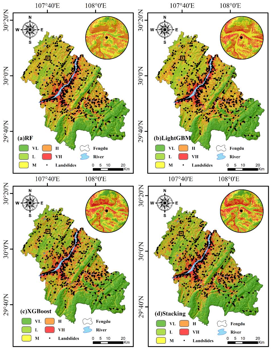 滑坡易发性是评估研究区滑坡灾害的空间概率的有效手段,可为灾害防治规划及工程实践提供科学依据。研究选择了RF、XGBoost、LightGBM和Stacking 4种机器学习模型进行评估,结果发现较高和高易发区主要分布在研究区的北部,中部和沿江两岸(如图2)。