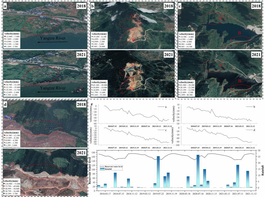 本研究以三峡库区丰都县为例,基于多时相合成孔径雷达干涉测量(InSAR)技术监测地表形变特征,创新性地整合了地貌环境相似性分析(GES),从与已知滑坡具有相似地理特征的区域中提取潜在滑坡样本。此外,考虑到三峡库区丰都县滑坡成因较为复杂,进一步开发了一种融合RF、LightGBM和XGBoost算法的异构集成模型(Stacking),有效捕获非线性关系并评估局部滑坡易发性。结果表明,水库沿岸的斜坡区域,受降雨和水库水位波动的影响,尤其是在丰水和干燥交替期,水位的剧烈变化会导致河岸斜坡的饱和度和承载能力发生变化,加剧表面变形并增加山体滑坡的风险(图1a和1c)。位于高海拔山麓斜坡脚下的潜在滑坡地点(如图1b)具有相对脆弱的土壤和岩石结构,陡峭的斜坡将土壤和岩石上的剪切力增加到重力,为滑坡提供了有利的滋生环境。一些潜在的滑坡位于丘陵梯田区域,该地区主要受人类活动影响,大量工程开垦了许多森林覆盖的地区,该行为导致降低了土壤对侵蚀和冲刷的抵抗力,加剧了土壤侵蚀,从而导致土层的不稳定性增加(如图1d)。成果实现了对复杂地理环境下潜在滑坡的有效筛查,并有效反映一定时期内的动态滑坡易发性,为灾害预防和管理提供重要支撑。