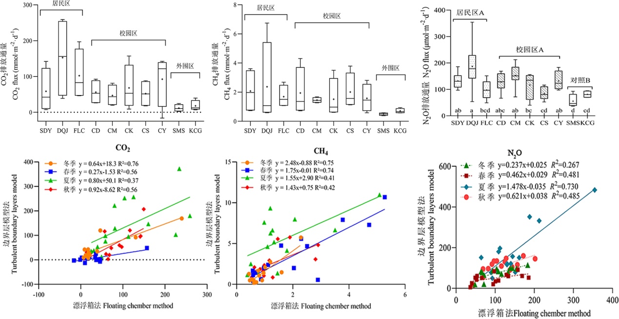 地理科学本科生黄婷和庞吉利等人在王晓锋副教授的指导下,选取重庆市大学城8个景观水体和周边2个自然水体为对象,开展了季节性调查分析,研究结果表明,城市景观水体均为大气温室气体的重要的来源,其中景观水体CO2,CH4和N2O的排放通量分别是自然水体的3.5-6.7、2.0-4.5和1.3-5.2倍。此外,景观水体温室气体排放在不同季节间呈现明显的变异规律,温度、降水、水体初级生产等为主要的控制因子。水体理化参数包括,pH, DO以及水体碳氮磷浓度对城市景观水体温室气体排放具有较好的指示性。城市小型景观水体 温室气体排放通量远高于大部分已有自然水体的研究结果,呈一种较强的大气排放源,在区域淡水系统温室气体排放清单中具有重要贡献,未来研究中应给以更多关注。研究还对不同方法在小型景观水体温室气体排放监测中的适用性进行了评估,为进一步开展大尺度研究提供了借鉴。