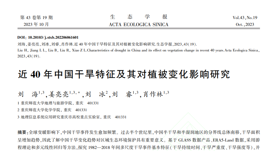 以题为《近40年中国干旱特征及其对植被变化影响研究》发表在一级学报《生态学报》。av大平台 研究生刘海为第一作者,姜亮亮老师为通讯作者。论文链接://doi.org/10.20103/j.stxb.202206061601