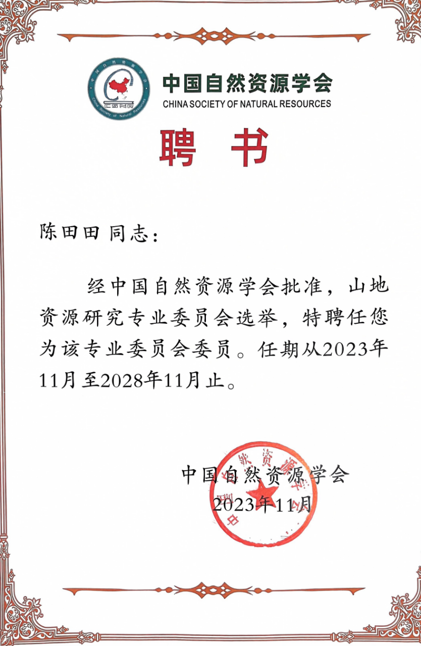 陈田田副教授被选举为中国自然资源学会山地资源研究专业委员会委员。