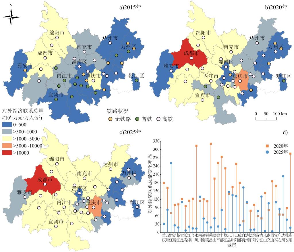 人文地理学专业研究生李欣潼以成渝地区双城经济圈高铁网络为研究对象,基于最短出行时间、加权平均出行时间、日常通达性指数、引力模型和空间杜宾模型,探讨了高铁网络通达格局演化与其产生的溢出效应。研究成果以“成渝地区双城经济圈高铁网络通达性的溢出效应”为题发表在《热带地理》。GIS应用创新团队研究生李欣潼为第一作者,戴技才老师为通讯作者。