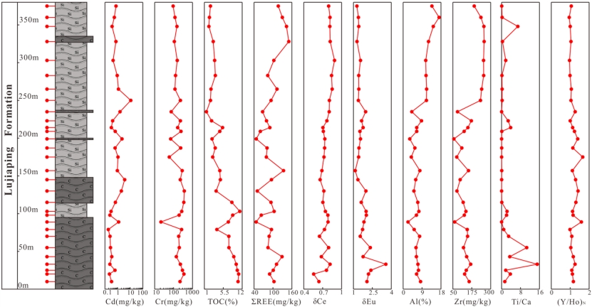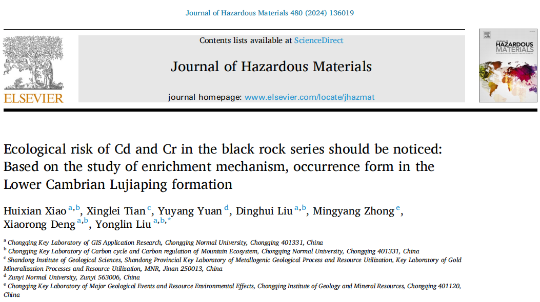 近日,av大平台 自然地理专业研究生肖慧娴以位于大巴山逆冲带的城口县北部下寒武统鲁家坪组(LJP)剖面出露黑色岩系为研究对象,采集30件岩石样品,硅质板岩(SS)、碳质板岩(CS)各15件,室内分析其常量和微量元素含量,逐级提取岩石Cd、Cr赋存形态,通过风险评估指数法(RAC)、次生相原生相比值法(RSP)对Cd、Cr进行生态风险评价,以揭示黑色岩系镉(Cd)、铬(Cr)的富集机制、赋存形态及其生态环境效应。研究成果以“Ecological Risk of Cd and Cr in the Black Rock Series should be noticed: Based on the study of Enrichment Mechanism, Occurrence Form in the Lower Cambrian Lujiaping Formation”为题发表在《Journal of Hazardous Materials》(中科院一区top,IF=12.2)上。GIS应用研究创新团队研究生肖慧娴为第一作者,刘永林老师为通讯作者。