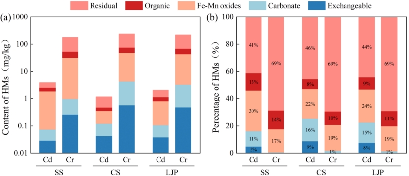 根据Tessier五步法对Cd、Cr进行逐级提取,Cd的生物可利用态占比为55.78%,Cr为30.98%(图3),Cd具有较高的迁移能力和环境活性。RAC、RSP结果也表明Cd的潜在生态风险高于Cr(图2)。因此,Cd具有很高的释放风险,生物可利用性和潜在生物利用性较于Cr更强。
