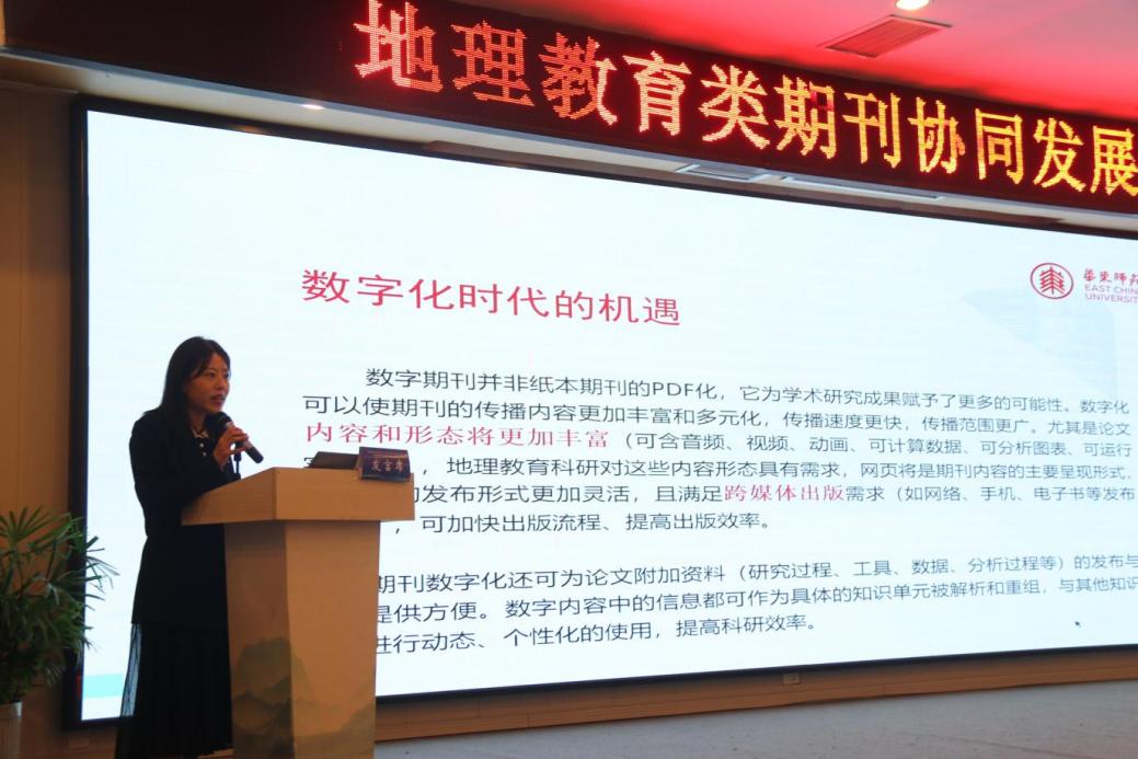 《中学地理教学参考》主编雷鸣以“地理期刊协同发展思考”为题作了报告。报告首先引用“天时不如地利,地利不如人和”“独行快而众行远”的观点,阐明三刊的发展需要合作才能实现共赢。随后点明教育期刊的使命,指出教育是人类社会发展的动力和基础,期刊是传承人类文明的工具。接着以亲自带队考察陕北黄土高原边缘、延安市甘泉县、毛乌素等地拍摄期刊封面的实例,体现了地理实践力在期刊发展的重要作用。最后呼吁策划微课创新比赛,以满足地理基础教育的迫切需求。
