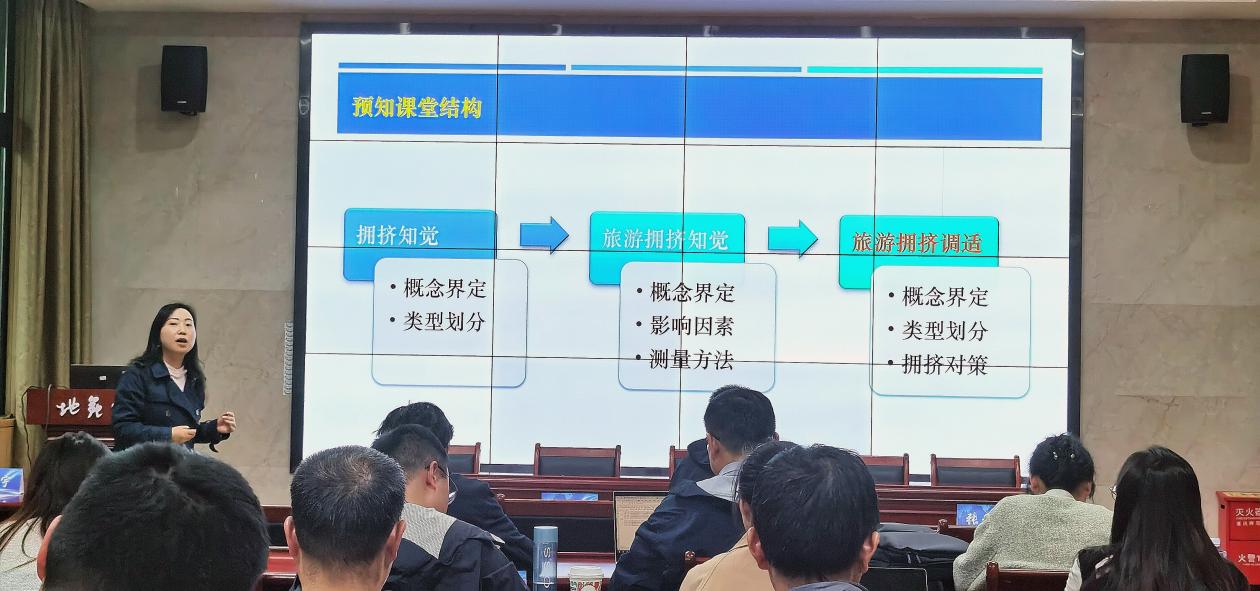 随后,杨渝红老师以《旅游消费者行为学》课程中的“旅游活动中的拥挤感知”为主题,进行了精彩的示范教学。她通过慕课堂平台布置课前任务,从学生已知知识点出发,结合生动案例,巧妙抛出“如何改变拥挤体验”的现实议题,引发学生思考。在课堂上,杨老师清晰展示课程结构,帮助学生快速把握课程脉络。她层层递进地阐述了“拥挤知觉”、“旅游拥挤知觉”及“旅游拥挤调适”等核心概念,通过概念界定、类型划分、因素分析、解决对策等多元方法,进行了深入剖析。在讲解过程中,杨老师注重引导学生辩证看待拥挤感知的主客观联系,培养他们独立思考与解决问题的能力。课程尾声,杨老师回归初始问题,提出基于课程知识的解决方案,并布置课后拓展任务,如“如何量化旅游拥挤”及“如何应对假期大客流”等,鼓励学生持续探索与深思。