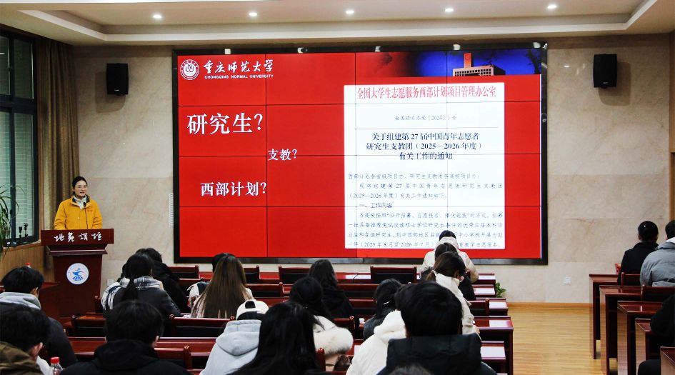刘江杭同学首先向大家阐释了研究生支教团的概念。研究生支教团是由各高校组织的一支服务团队,旨在招募一批符合推荐免试攻读硕士学位研究生资格的优秀应届本科毕业生及在读研究生,前往中西部地区的县级及以下中小学校,开展为期一年的基础教育教学志愿服务。随后,她分享了重师研究生支教团的故事,以第24届研支团成员、航空服务艺术与管理专业2018级的徐静同学为例,讲述了她在西藏昌都支教的动人经历。她引用了“用一年不长的时间,做一件终生难忘的事”这句格言,深深触动了在场同学的心灵,同时也在他们心中种下了扎根基层、服务西部的种子。
