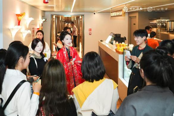 首先游轮经营管理负责人对师生们的到来表示热烈欢迎,并就游轮的基本情况和本次活动参观安排进行了说明。接下来同学们在管理人员带领下同学们进行了自由学习考察,不仅参观了游轮的各个部分而且品尝了游轮特色下午茶,还参与了一些游园活动,与NPC进行一些互动打卡,体验了一场对话古今的游轮之旅。
