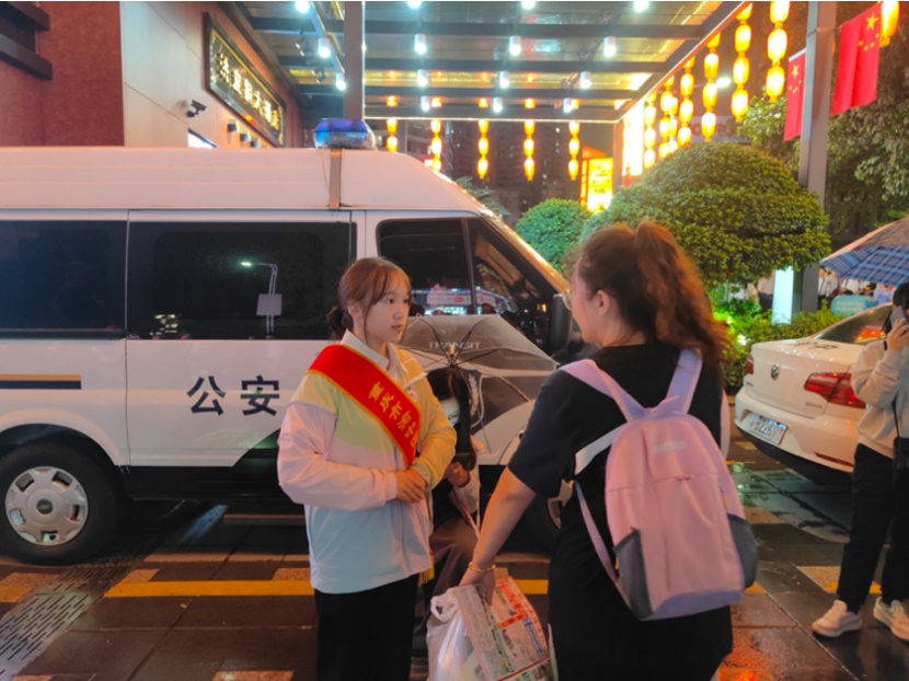 国庆假期秋夜的绵绵冷雨,挡不了游客对于洪崖洞的热爱,作为一名旅游专业的学生,用自己所学的专业知识为游客答疑解惑,帮助游客更好的了解洪崖洞、了解重庆。我们用微笑和热情传递着友谊与温暖,用真诚和担当诠释着奉献和责任,用行动践行着诚实守信、文明旅游的理念。这次的文明旅游志愿服务让我收获颇丰,未来我将继续参加更多旅游志愿服务活动,为旅游事业贡献自己的一份力量。青春不以山海为远,志愿只向国家未来。
