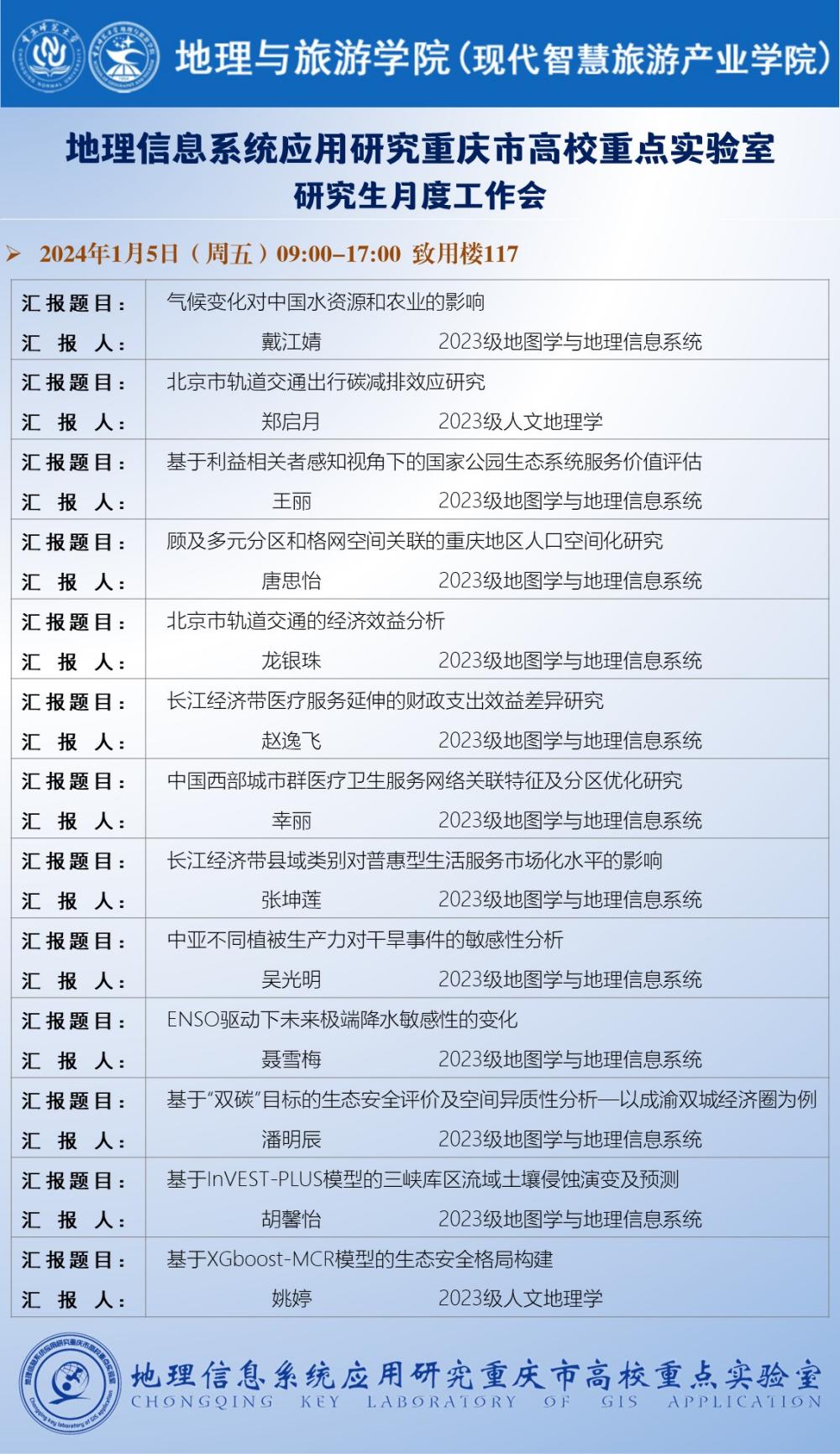 在汇报环节,同学们展示了近期的工作进度和阶段性的研究成果,与现场专家进行了深入的讨论和交流。本次汇报主要涵盖了交通出行、公共服务配置、生态系统服务、极端气候、生态安全和土壤侵蚀等相关研究主题,体现出良好的地理学科与其他学科交叉融合的理念。同时,各项研究工作涉及了重庆市、成渝双城经济圈、三峡库区、长江经济带、中亚地区、全球等多尺度的研究范围,深化了师生对不同区域研究差异的理解。