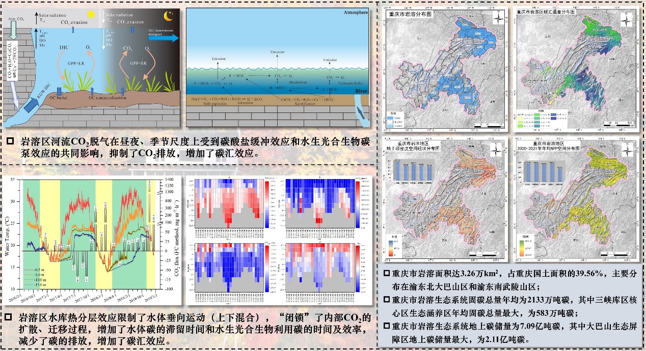 “岩溶碳汇”被列入国家“碳达峰、碳中和”行动方案,提升、优化和稳定岩溶碳汇成为国家实现“碳中和”目标重要路径。在地球系统科学思想指导,蒲俊兵研究团队围绕岩溶碳汇机制、碳汇评价与优化调控关键科学问题,在岩溶碳汇形成机制方面取得了系列成果。研究发现中国西南岩溶区河流生态系统中碳酸盐缓冲效应与水生光合生物碳泵效应的协同作用促进了岩溶碳汇生成与稳定发展;发现了岩溶区水库可直接吸收大气CO2形成显著碳汇效,并揭示了“闭锁水体内部CO2扩散、迁移的机制,为岩溶碳汇形成和稳定提供了新途径。团队较为系统地评价了重庆岩溶生态系统碳储量现状、碳汇能力及潜力,发现重庆岩溶生态系统固碳总量年均2133万吨,地上碳储量为7.09亿吨;重庆武陵山生态屏障区、三峡库区核心区生态涵养区、大巴山生态屏障区碳汇现状储量大,而丘陵谷地生态品质提升区、大娄山生态屏障区增汇潜力大。相关成果发表在国内外学科领域前沿学术期刊,部分成果多次被中国应对气候变化的政策与行动年度报告(IPCC)(2019,2022,2023)采用。