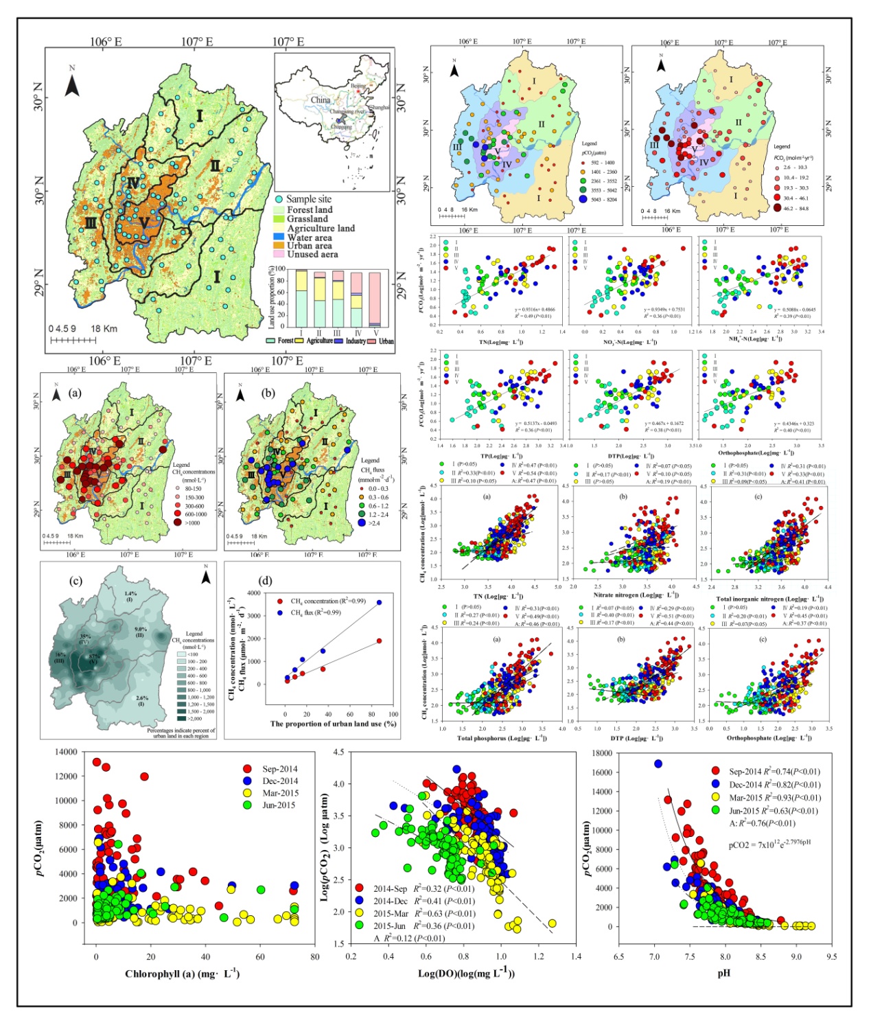 河流是连接陆地与海洋两大碳库的关键通道,同时也会向大气排放CO2和CH4等温室气体。随着全球城市化的不断推进,大量人为碳氮输入河流,造成河流碳排放的增强。团队通过对重庆主城区河网系统的高空间分辨率的监测分析,确定了城市化过程导致河流水体CO2和CH4排放显著增强,城市河流是温室气体排放的热源;揭示了陆域城市化强度与河流水体碳排放的模型关系,构建了基于土地利用类型变化以及水质参数的大都市区河网系统碳排放预测模型;特别是发现不同城市化强度下河流CO2与CH4排放调控机制存在差异,强调构建不同人为干扰下的河流碳排放动态模式。相关研究发表在Journal of Hydrology、Journal of Geophysical Research、Science of Total Environment、环境科学的国内外期刊,同时被IPCC第六次评估报告引用。