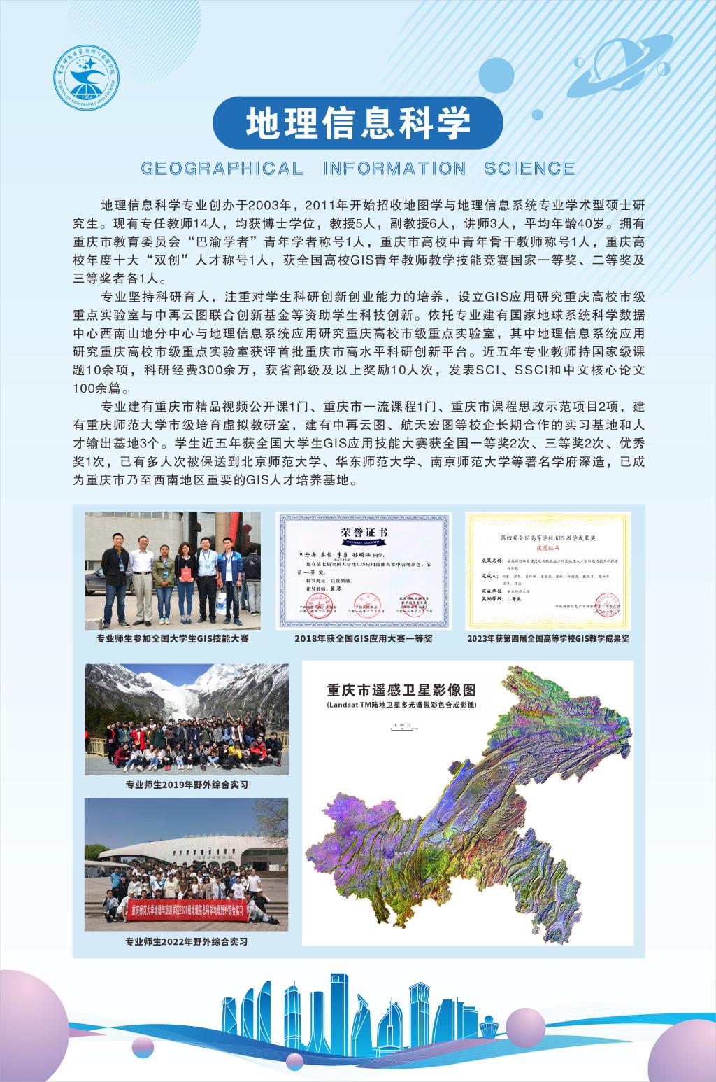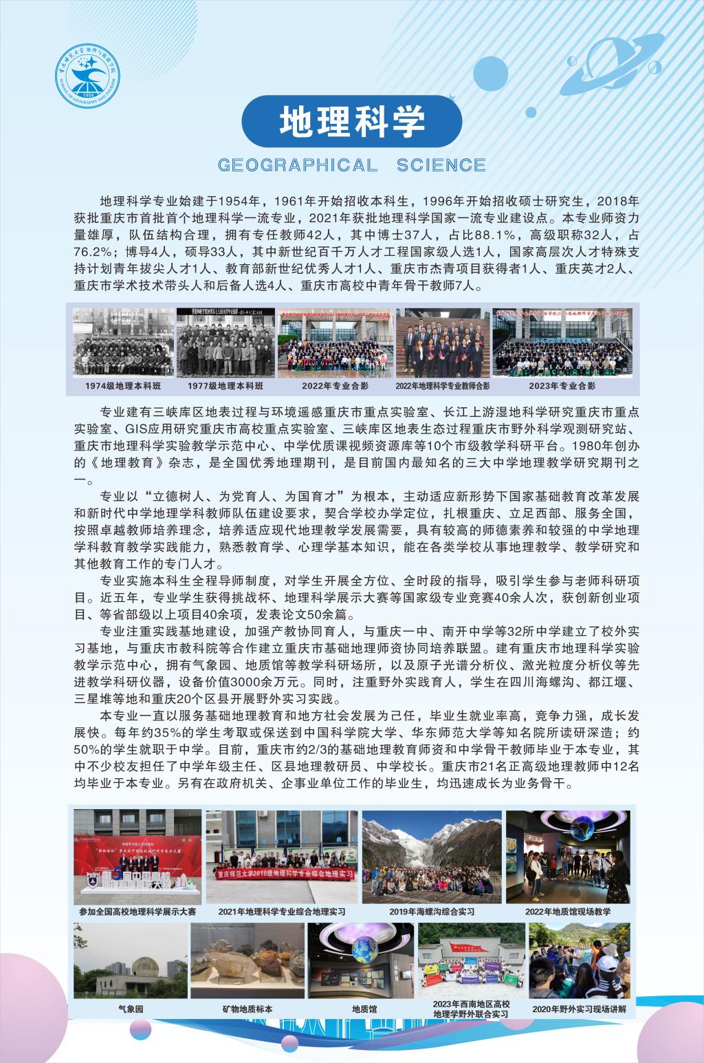 长期以来,学院以提高人才培养能力为关键,形成了全员全过程全方位育人格局,获批“三全育人”建设示范学院;以育人机制建设为重点,构建一体化的育人共同体,先后获批全域智慧旅游重庆市2011协同创新中心、重庆市首批人工智能+学科群(智慧生态旅游)、重庆首批市级示范性现代产业学院、重庆市普通本科高校空天遥感信息工程产教融合虚实一体化实践教学平台;以注重学生实践能力为核心,推动一二课堂有效衔接,面向国家战略需求和区域经济社会发展需要,培养了大批中学地理特级教师和地理、旅游、民航服务等行业骨干人员,重庆市仅有的29名正高级地理教师中,21名毕业于本专业。